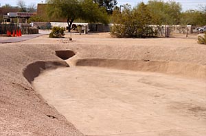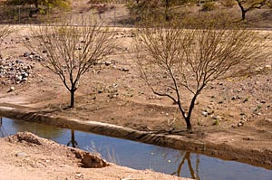 But where did they get their water from? Well, the Salt River today is a dry river bed that runs through the Phoenix area and rarely has water flowing in it due to dams that were built up-river to control seasonal flooding and provide a predictable water supply. However, when the Hohokam lived here, water did flow in the Salt River and they built an extensive system of canals to bring water to their fields. The picture at left is a modern canal (if the late 1800s can be called “modern”) but similar in size and appearance to what the Hohokam built and maintained using primitive tools.