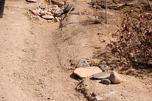 Smaller “feeder” canals provided water to individual plots of land such as in the photo to the right. Stones were used as gates to control the amount of water to an individual plot. The plant shown here is cotton but they also grew corn, squash, amaranth and beans. Trees planned along the canals also provided seeds, nuts and fruit. Thousands of acres were under cultivation and must have required a lot of work, cooperation and coordination on the part of the villagers.