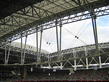 Two other small differences between then and now were (1) the grass field was now indoors and (2) the roof was open. Interestingly, in today's Arizona Republic, there was an article criticizing the condition of the grass surface. They suggested that moving the grass inside and outside has confused the grass — so it doesn't know whether to grow or go dormant. Roger and I both thought the grass looked a bit brown in the middle of the field — and even worse at end of the game.