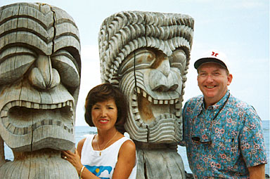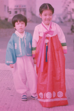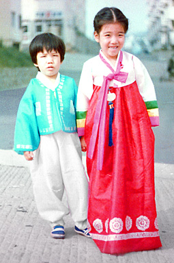 The JPG photos do not adequately show how the technology of digital photography has improved. Since I have prints of these same photos, I can see (please take my word for it) that we are light-years ahead plus my skill has improved over these humble initial efforts on my part. One blessing that Kona left us are her two wonderful adult offspring (can't call them kids anymore). Below left is an old photo of Hogan and Jiyoung in Korea, wearing Korean traditional clothing. The color shift was significant and I worked very hard to remove it, resulting in the improved version below right.