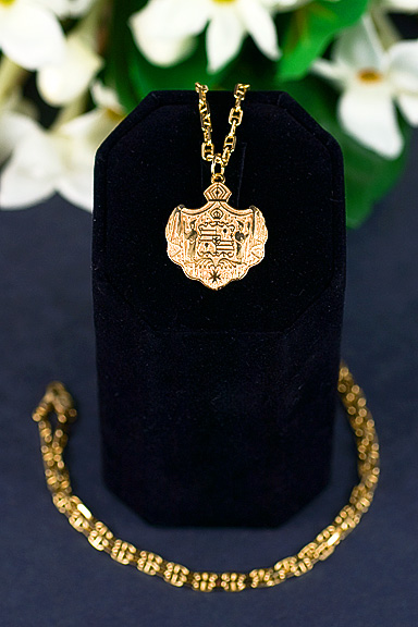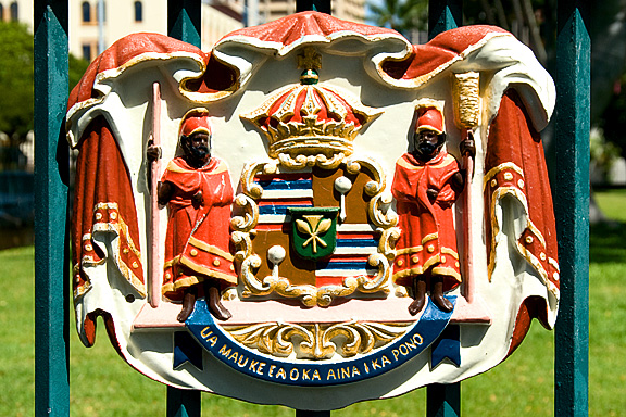 The pendant pictured above is mine — which I have worn for probably 20 years. The pendant displays the royal coat of arms of the Kingdom of Hawai`i (see the one to the right that I photographed on the gate at `Iolani Palace). It seems to surprise some people that I would wear a pendant — I guess I don't look like a pendant person. However, it is one of my most cherished possessions. |
