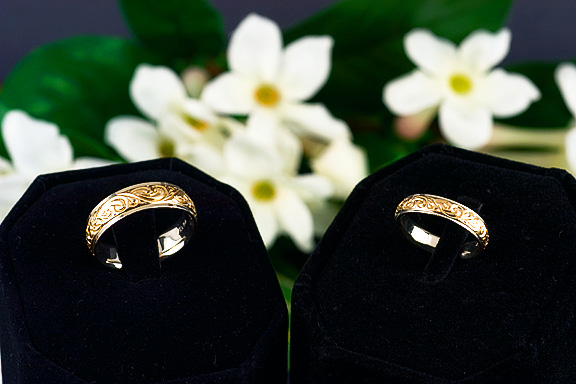 Some people may also think that Mizuki and I are a bit strange because we have three pairs of wedding rings (or would you call them marriage rings if they were not exchanged during your wedding?). One pair is, quite naturally, Hawai`ian Heirloom jewelry. These follow the traditional carving of floral scrolling designs although they do not have our names in black enamel. The rings are actually fabricated of two types of gold — the center is yellow gold and the edges are white gold. Periodically, we will switch the rings that we are currently wearing — but we always match. |