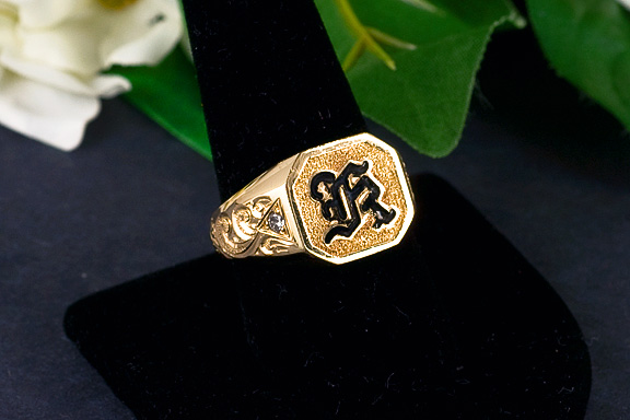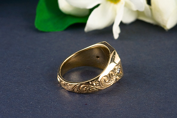 The ring was never recovered and I have been ringless on my right hand ever since. This trip to Hawai`i seemed like a good time to rectify that shortcoming. This design does incorporate an enameled old-English letter. Oops you say — the letter is wrong — it is a "K" when it should be "B" or "D" or "C". Well, many people follow the custom of using their Hawai`ian name for Hawai`ian Heirloom jewelry — and my Hawai`ian name is "Kawika" — so "K" is appropriate. You can clearly see the floral scroll patterns carved in the gold in both photos. You might also note a small diamond on the side (of course there is one on each side) — perhaps not traditional but I like the enhancement. All my Hawai`ian Heirloom jewelry was crafted by hand by the same company — Precious Metals Hawai`i in Honolulu. There are quite a few companies that sell this style — some better, some not so good. PMH does excellent work, is happy to customize the piece and thus I keep going back. |
