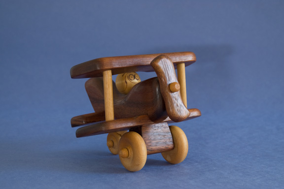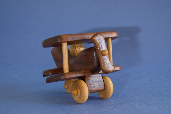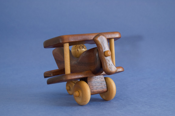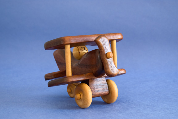 To start, I took a photo of a koa wood airplane in my studio using only ambient light (morning light from north- and west-facing windows). I metered the light with the light meter in my camera and set the aperture to f/5.6 and the speed to 1/4 second. Not a bad image, I thought, especially considering the low light level. Naturally, I had to mount the camera on a tripod since I cannot hold a camera steady for 1/4 second (1/30 second is tough enough). I used the same setting for each photo below. |
