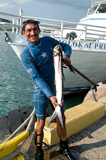 I returned the rental car and they dropped me off at the Kaunakakai Harbor so I could catch the ferry to Maui. You can see the boat in the background of this photo — but the more interesting sight was this guy who had been spear fishing and made quite a catch. The funny thing was that I spotted a different guy holding the fish. I asked if I could take his picture and he said the fish wasn't his — his friend caught it — and that I should take the picture of the real fisherman. What friends! |