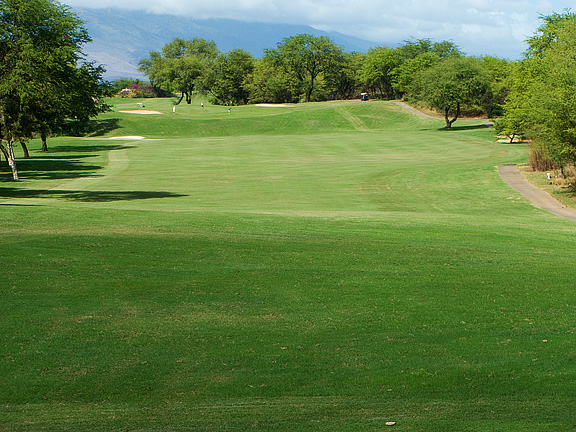 The courses on Maui are among the most scenic in the world. Here is a typical fairway at Wailea — not only are the holes beautiful but the scenery beyond the course is breathtaking. For example, on this hole, we are looking toward the West Maui Mountains, perpetually enshrouded in clouds. |