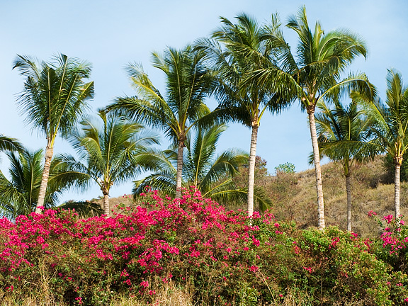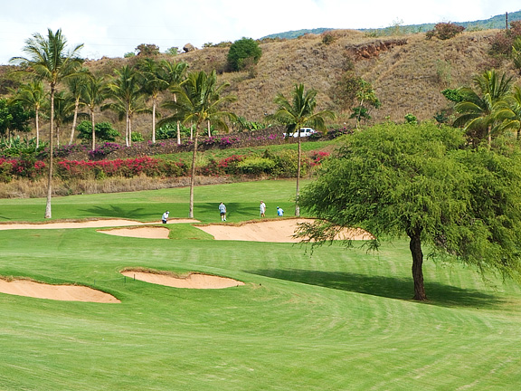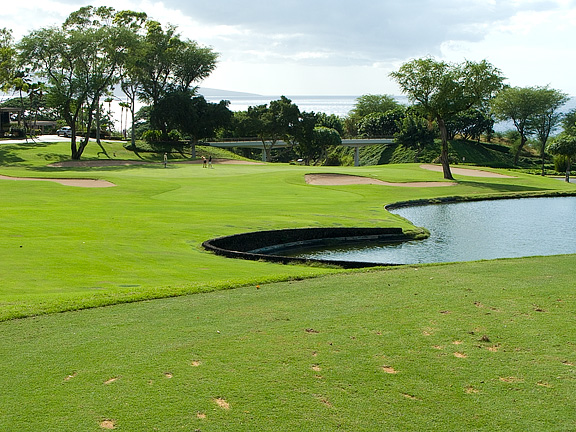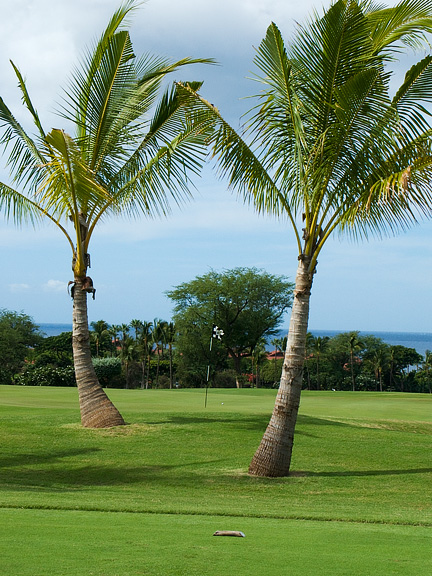 And what course would be complete without Bougainvillea and coconut palm trees? Certainly not this one. By the way, one thing that you cannot tell just from the photos is the amount of wind that the golfer must face when playing on Maui. The trade winds blow nearly every day — generally 15 to 25 MPH, occasionally blowing even stronger. Typically they are milder during the morning and more gusty during the afternoon. But for someone who regularly plays his golf in mostly calm Arizona, it is a real challenge to choose a proper club and aim to take the wind into account. |
