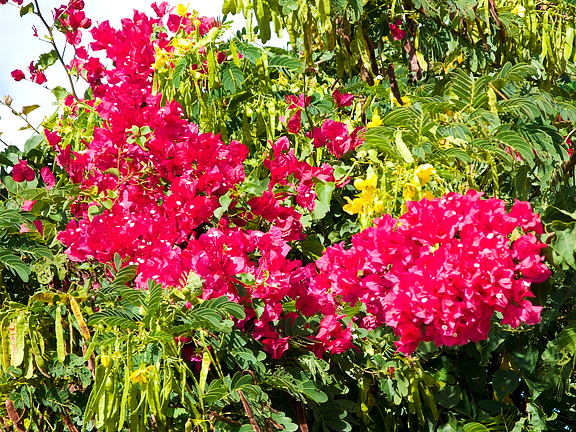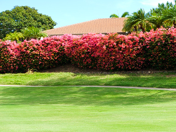There are magnificent homes lining the fairways. Another game we play on the course is picking out our future home in the event we win the Powerball Lotto. This one is surrounded by a hedge of Bougainvillea. The brightly colored bracts add so much color to contrast with all the green vegetation. Wonderful! |