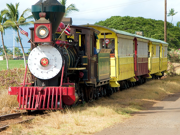 And just as you are about to make that perfect shot, you hear the chugging of a old fashion steam locomotive. A train? On Maui? Yes, this is the world-famous Sugar Cane Train. It is the remnant of a bye-gone era when sugar cane was hauled to the mill on the rails rather than the contemporary practice of hauling by trucks. You can pay a modest fee and ride the train from Lahaina to just past Ka`anapali Beach. But if you are playing golf, just hope that they don't sound the whistle just as you stroke your putt. No do-overs are allowed. |