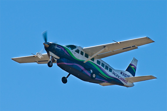 I flew in on a Island Air Dash 8, that holds 37 or so passengers. The aircraft pictured here is even smaller — it only has one fan, I mean prop. But this is how one gets to Moloka`i. If propeller aircraft make you nervous, stick with O`ahu, Maui, Kaua`i or the Big Island. |
