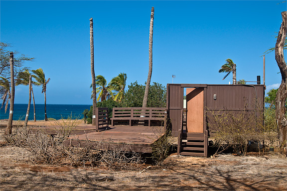 Now it is a rest station for the few hikers who wander this way. If you look carefully, you can see a couple sitting on a picnic bench in the shade. If I recall correctly, they were from Germany. Can you imagine coming all the way from Germany to sit at a picnic table on the grounds of an abandoned resort on the island of Moloka`i? The ladies that I met at the beginning of my hike told me that the shower was still working — a pleasant way to cool off after a long dusty hike. But one of the most curious discoveries is that if you do a Google search on "The Beach Village at Molokai Ranch" you will find reviews and information that suggest that it is still in operation. It shows how long some out-of-date information remains on the Internet. |