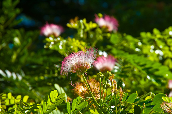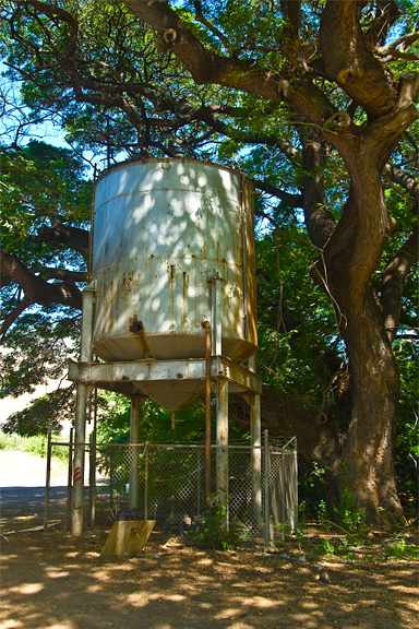 The book provided instructions on where to find the petroglyphs — go to Olowalu, look for the water tower and drive uphill from there. Poor instructions. So I had to ask at the General Store — and they were quite helpful. Leave your car in their parking lot, walk to the road that runs behind the store, turn left and walk a short distance until you find the old water tower then turn right and walk about half a mile uphill. I'll add, "take water" since it can be a warm, thirsty walk. As you may have guessed, the photo above is that old abandoned water tower. My guess is that it is a remnant of the plantation days when sugar cane covered the hills above Olowalu. The tree above the water tower is a monkey pod tree and was covered with the beautiful powder-puff flowers shown in the photo to the left. |
