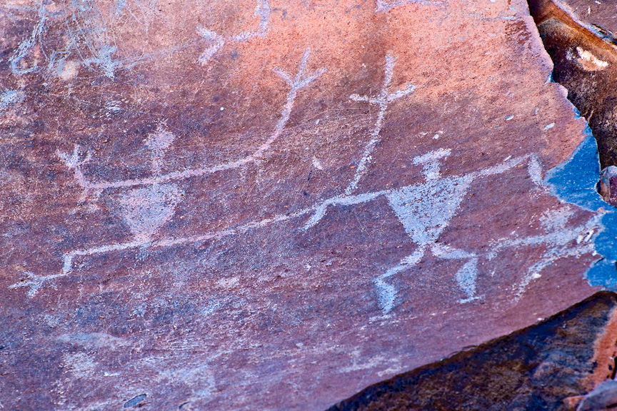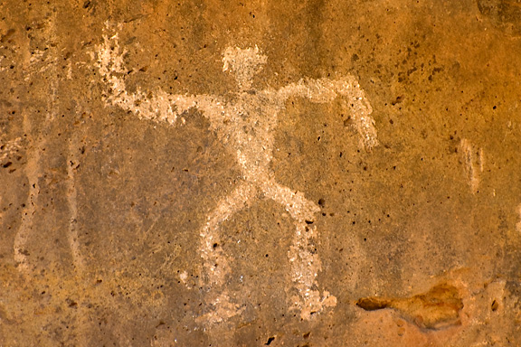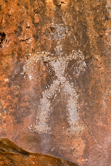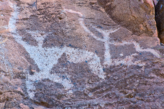 Two more — but I really wonder if these are ancient or just modern graffiti in a similar style as the petroglyphs. The one on the left did not appear to have been completed but maybe a quick attempt. The one on the right is too anatomically correct. Additionally, they were in a different area of the rock face from most of the petroglyph. For these reasons, I am skeptical. |