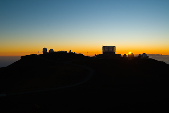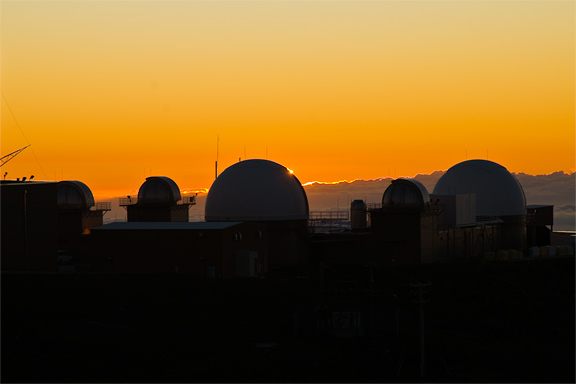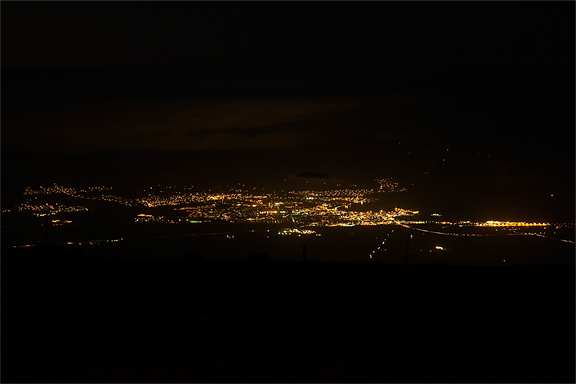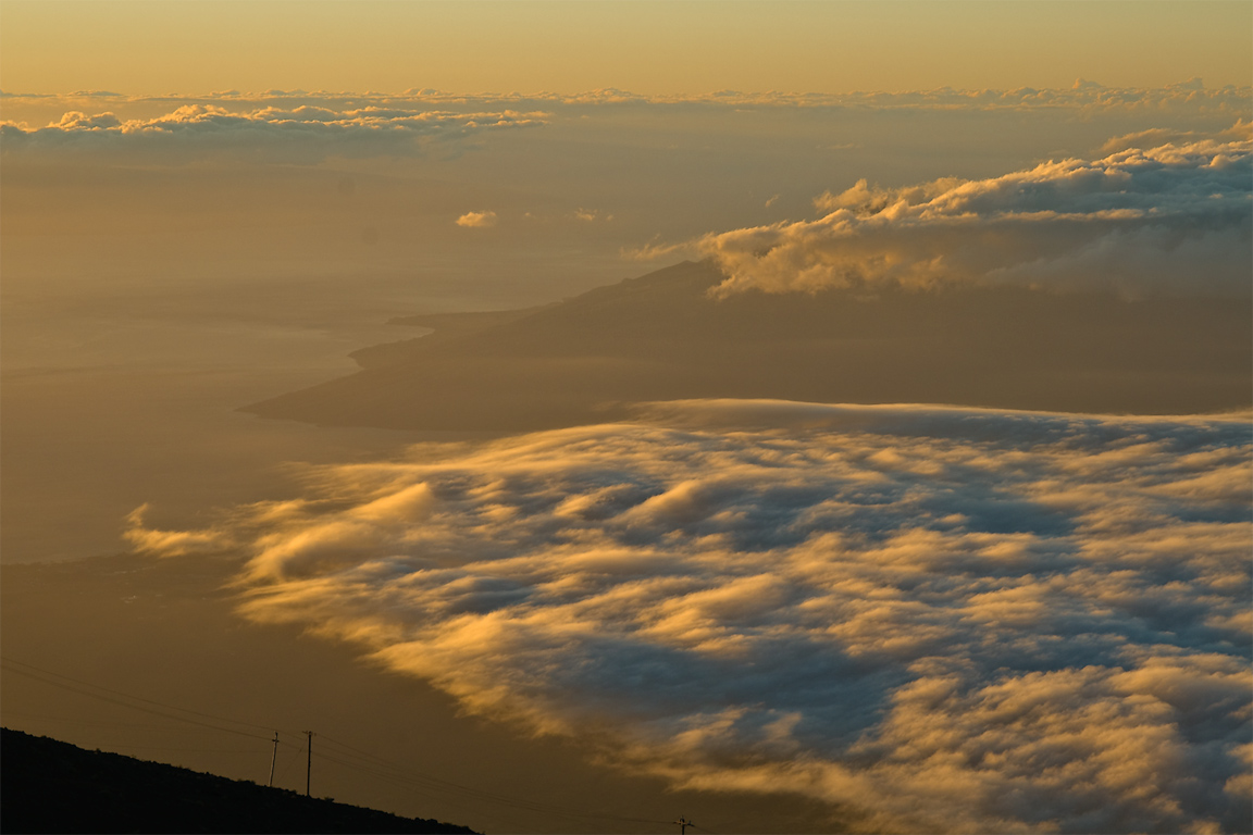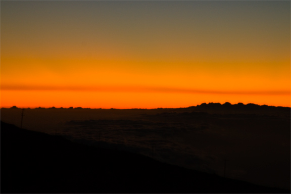Eventually, the terminator was a thin bright line on the horizon — and I looked down from Haleakala at the twin towns of Kahului (where the airport is) and Wailuku (the county seat). |