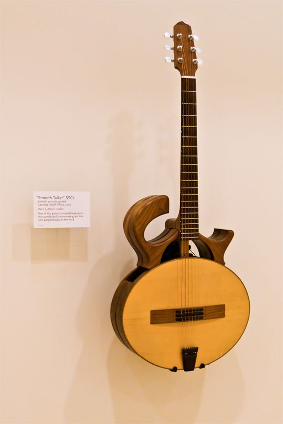 This guitar is a "Smooth Talker" SSC2, an electric acoustical guitar made by Davis Luthiers. One of the unusual aspects of this guitar is that the grain of the soundboard runs perpendicular to the neck. |