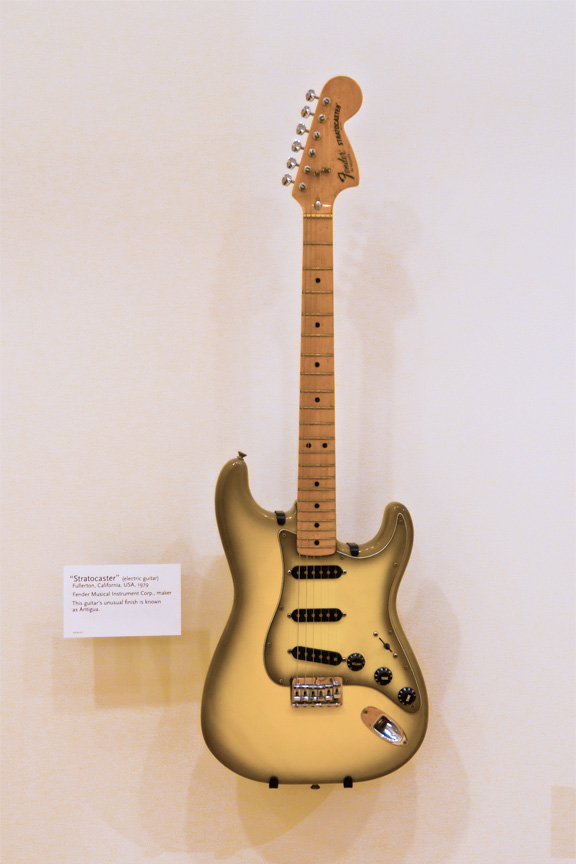 Here we encounter a Stratocaster electric guitar from Fender — nicknamed the "Strat", it has been manufactured continuously from 1954 to the present. The design of the Stratocaster has transcended the field of music to rank among the classic industrial designs of all time; examples have been exhibited at major museums around the world. |