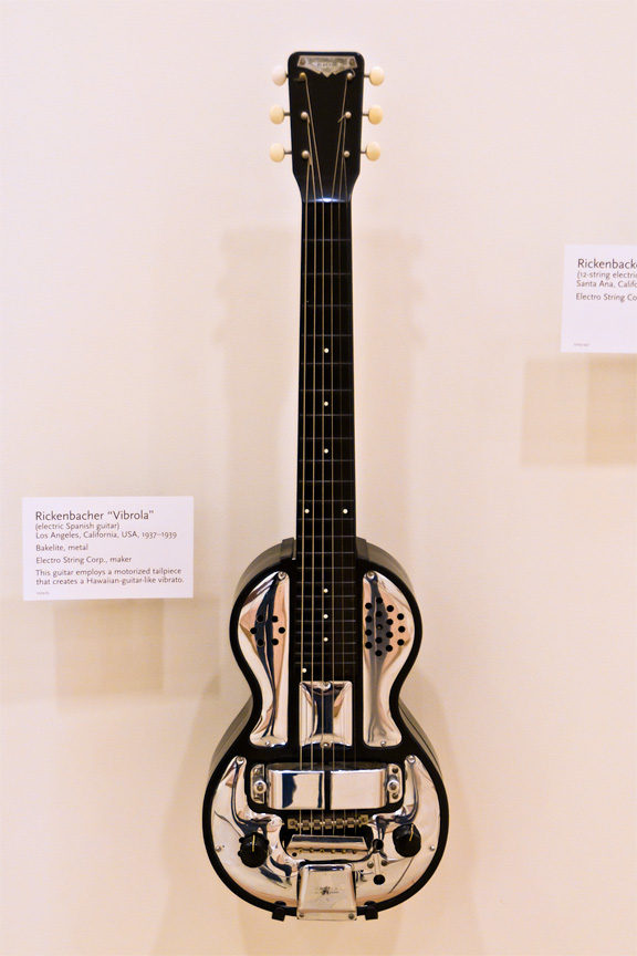 This guitar caught my eye because of its unusual design. It is a Richenbacher "Vibrola" electric spanish guitar made in the late 1930s. It employs a motorized tailpiece that creates a Hawai`ian-guitar-like sound. |