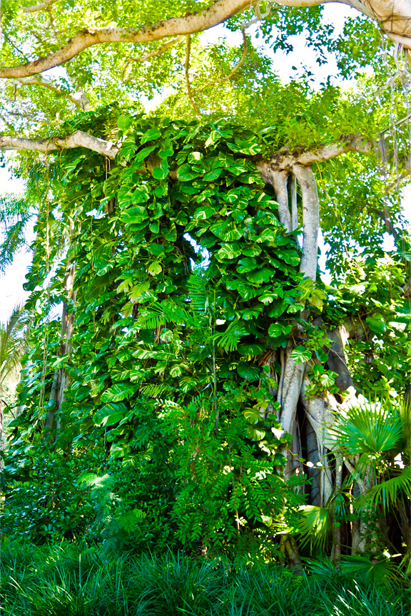 I also love banyan trees with their aerial prop roots that grow into thick woody trunks which, with age, can become indistinguishable from the main trunk. Old trees can spread out laterally using these prop roots to cover a wide area. Perhaps my affection is related to the huge Banyan tree found in the center of Lahaina, Maui.