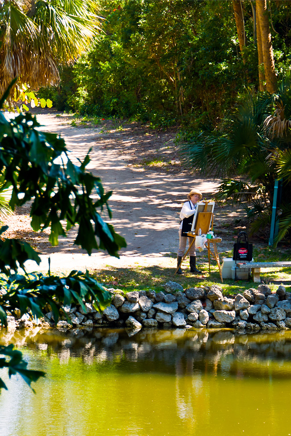 As I mentioned earlier, the foundation that maintains the Bonnet House is involved in nourishing the arts. It is not unusual to see a painter with her easel, capturing scenes of the estate on canvas. She has chosen a particularly scenic spot — along the slough in back of the house — backed by the footpath to the beach.