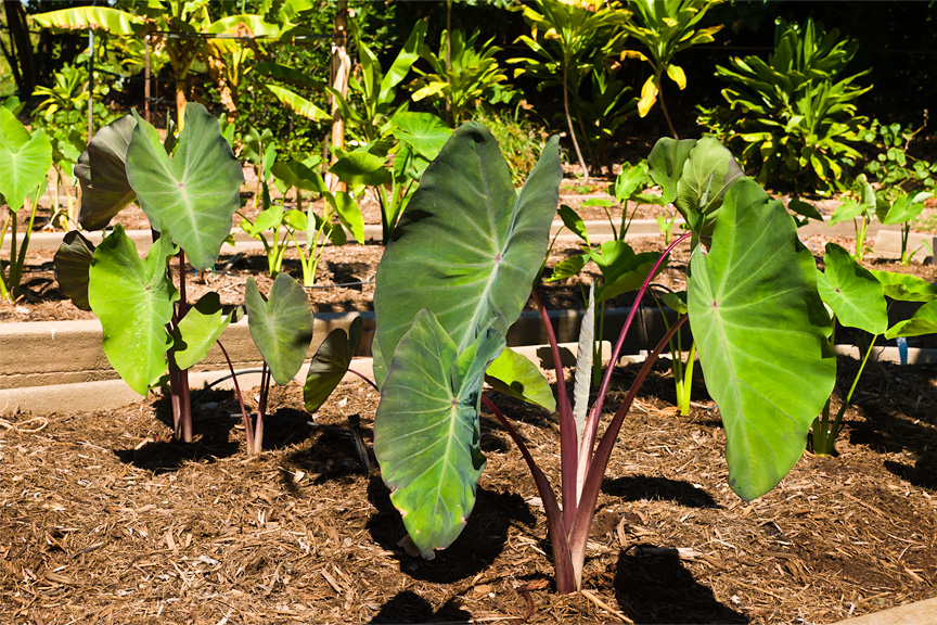 The corms are roasted, baked or boiled then eaten immediately or allowed to ferment producing poi — the staple starch of old Hawai`i. |