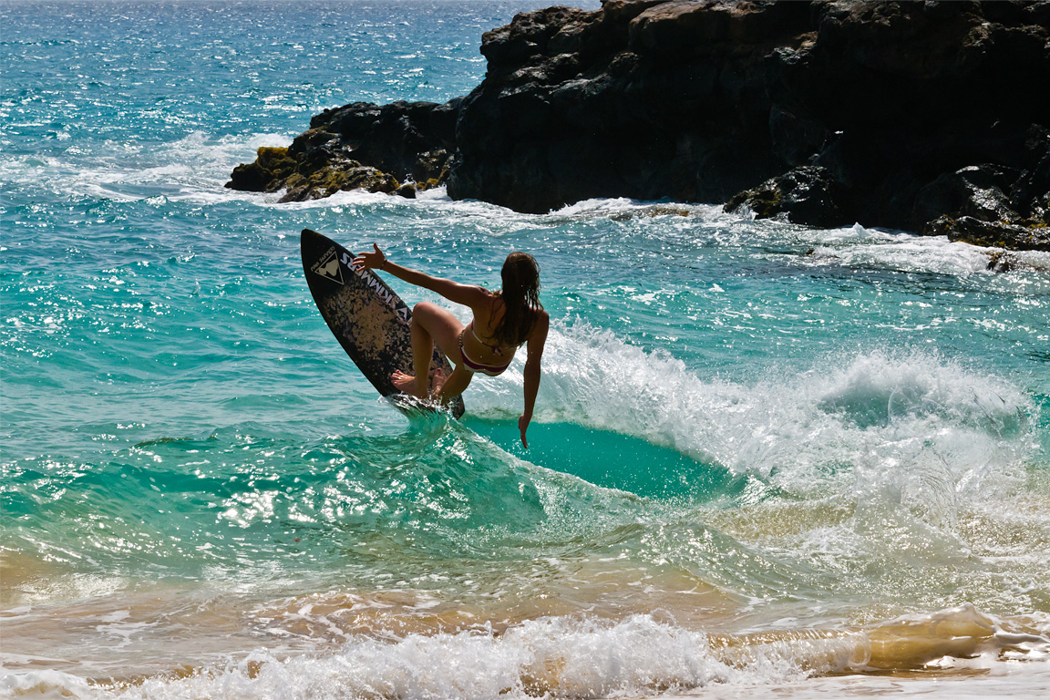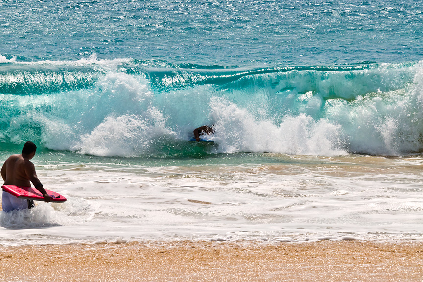 So many different ways to enjoy the waves. Here a young woman is using her skim board near Pu`u Olai where the waves were a bit tamer. Of course that did not prevent her from wiping out. In fact, that almost seems like the objective.