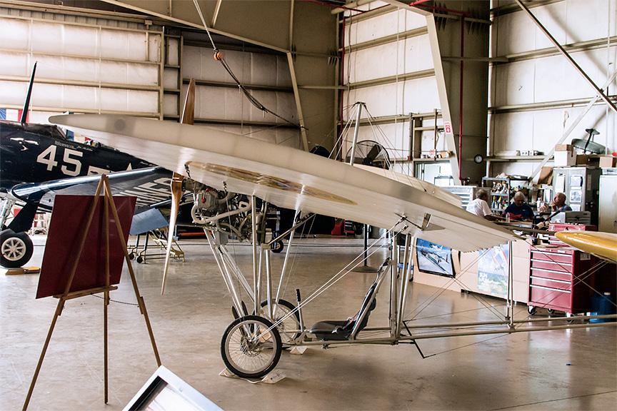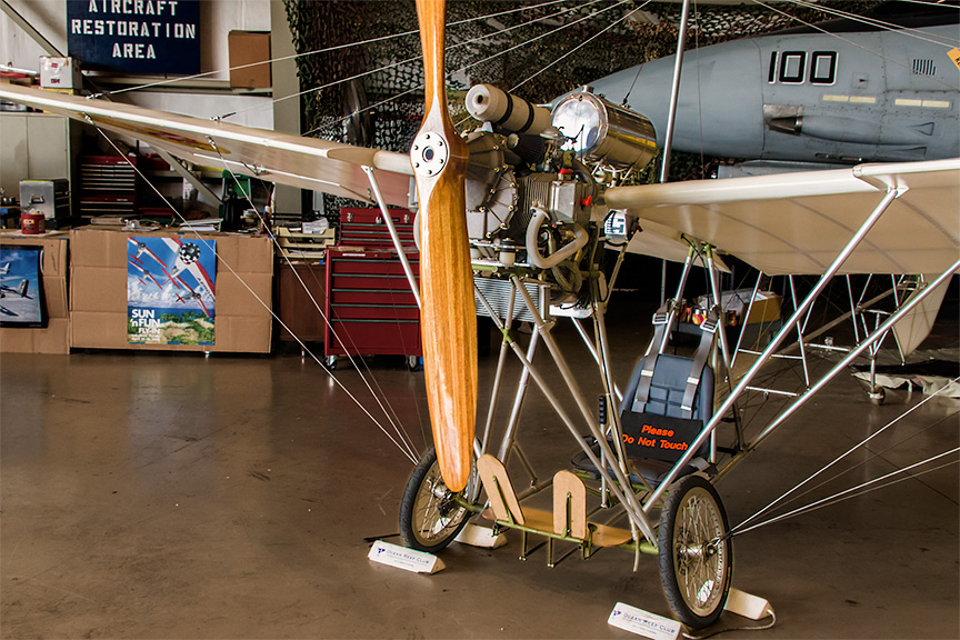 The museum has an eclectic mix of aircraft in its collection. This is a replica of Alberto Santos-Dumont's Demoiselle (Damselfly). It is a light-weight monoplane with wire-braced wing mounted atop an open framework fuselage.