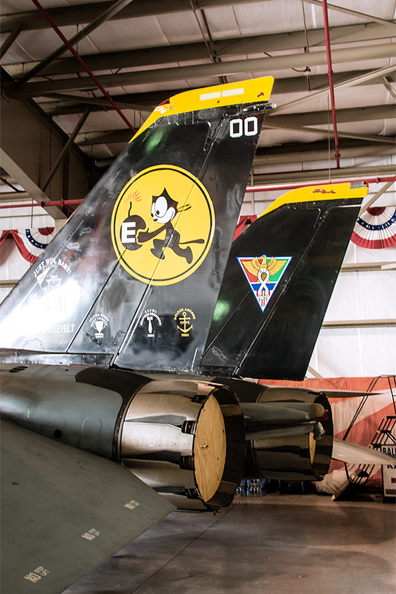 At the other end of the aircraft power spectrum is this F-14D. Made by Grumman for the Navy, the F-14 Tomcat is a supersonic, twin-engine, two-seater with variable-sweep wings. Per Wikipedia, "The F-14 first flew in December 1970 and made its first deployment in 1974 with the U.S. Navy aboard USS Enterprise (CVN-65), replacing the McDonnell Douglas F-4 Phantom II. The F-14 served as the U.S. Navy's primary maritime air superiority fighter, fleet defense interceptor and tactical reconnaissance platform. In the 1990s it added the Low Altitude Navigation and Targeting Infrared for Night (LANTIRN) pod system and began performing precision ground-attack missions. The Tomcat was retired from the active U.S. Navy fleet on 22 September 2006, having been supplanted by the Boeing F/A-18E/F Super Hornet. As of 2012, the F-14 was only in service with the Islamic Republic of Iran Air Force, having been exported to Iran in 1976 when the U.S. had amicable diplomatic relations with the then government of Shah Mohammad Reza Pahlavi."