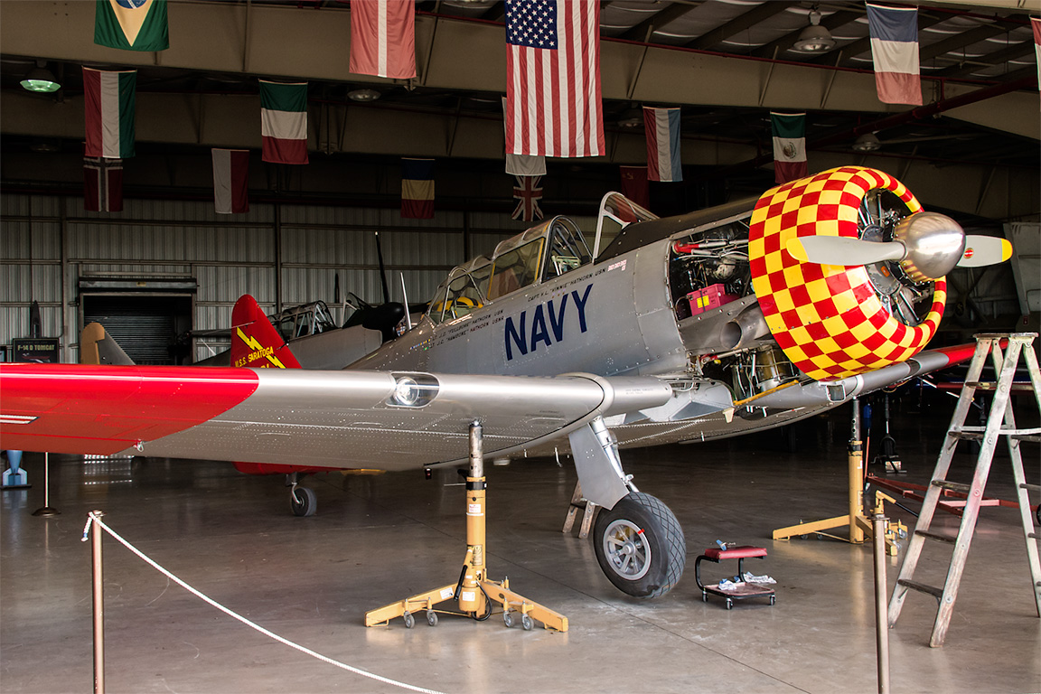 This is a slighter newer version of the above, an AT-6G which flew from the U.S.S Saratoga. Interestingly, during the Korean and Vietnam Wars, these planes were pressed into combat service as forward air control aircraft. The were nicknamed T-6 "Mosquitos".
