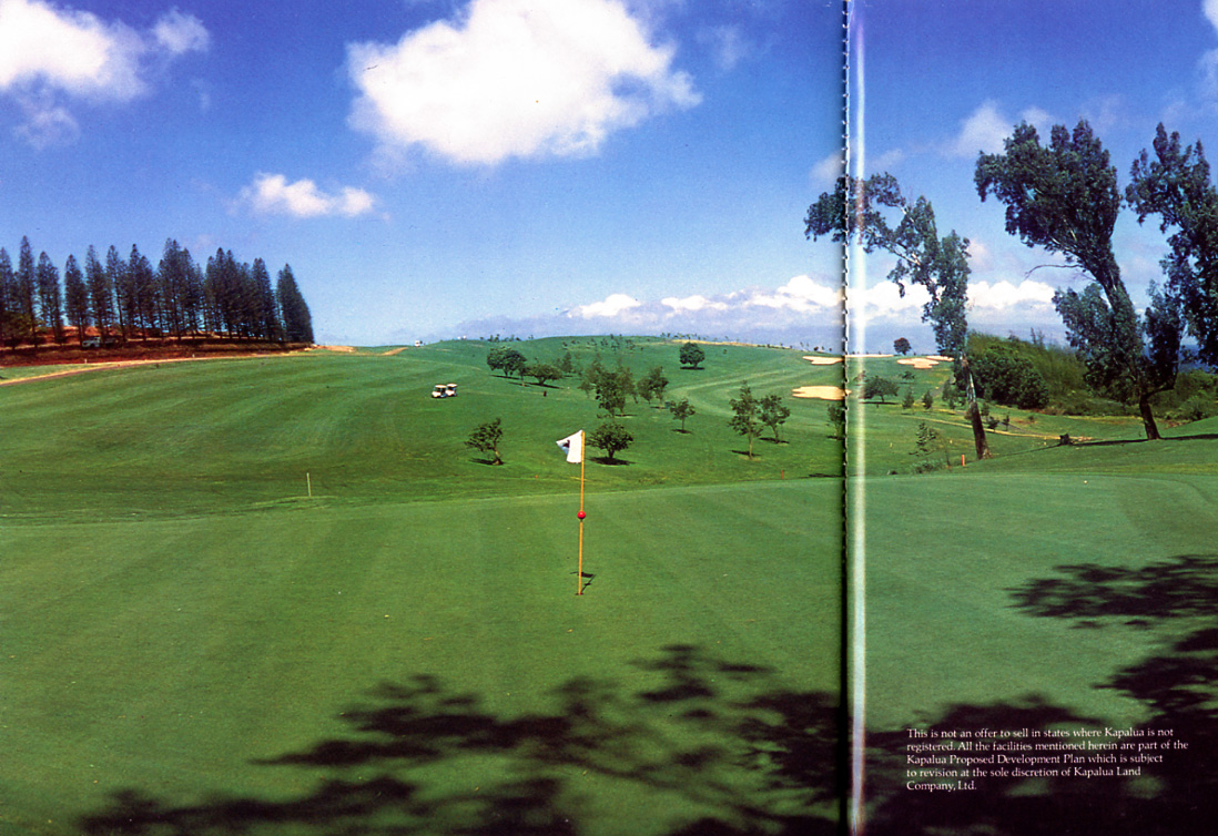 April brought a scanned image of promotional materials for Kapalua from when it was new. At that time it was a Rockresort, catering to the rich and famous. Here the photo of the very new, Arnold Palmer-designed Bay Course. Today the trees are bigger — much bigger, in fact — but otherwise it looks much the same.