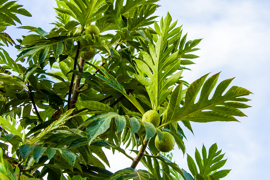 Breadfruit (or ulu, as it is named in Hawai`ian) was one of the few subsistence plants the Polynesians brought with them when they sailed to the Hawaiian Islands. It never became a staple food here as it was on islands further south. Taro played that role. Even so, ulu's mythical origins, its fame in history, and its immense usefulness to islanders have made the tree an immortal symbol of Hawai`i Nei. |