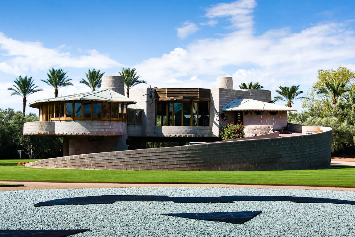 "In 1950, Frank Lloyd Wright designed a home for his son, David, and daughter-in-law, Gladys, on 10 acres in the middle of citrus groves at the base of Camelback Mountain in Phoenix, Arizona. The design elevated the home in the form of a spiral rising from the desert floor, converting the treetops into the lawn and revealing 360° views of the mountains forming the valley. Mr. Wright titled the plans 'How to Live in the Southwest'." — From the brochure provided by the David and Gladys Wright House Foundation This photo shows the house (left), the guest house (right center) and Camelback Mountain. For those not familiar with Phoenix, the camel is lying on its stomach with the hump to the right and his head in the center.