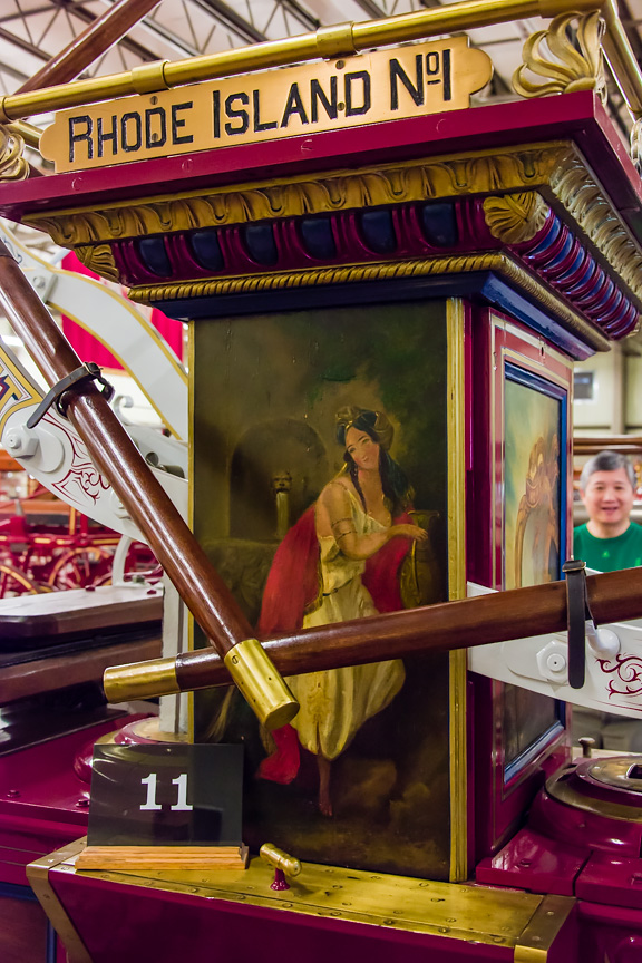 As time passed, fire engines became more elaborate both in function and decoration. This Jeffers Philadelphia style pumper was built in 1844 by the Joel Bates firm for the Rhode Island town of Pawtucket. Four years later, Pawtucket fireman William Jeffers rebuilt it. The two sets of pump handles were manned by fifty men capable of pumping 250 gallons per minute.