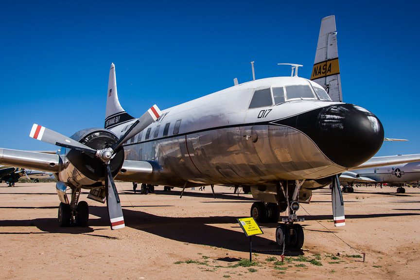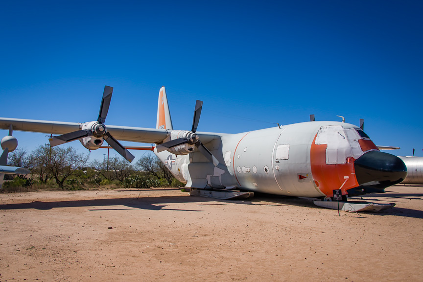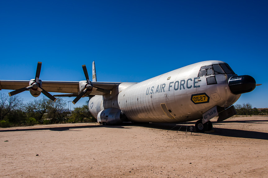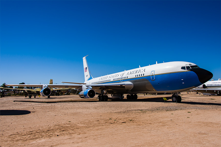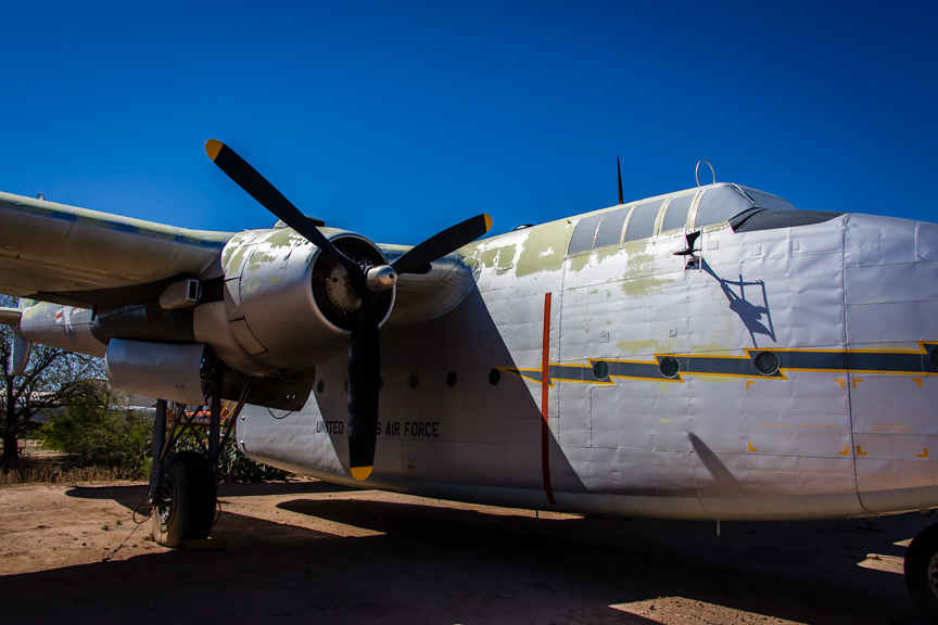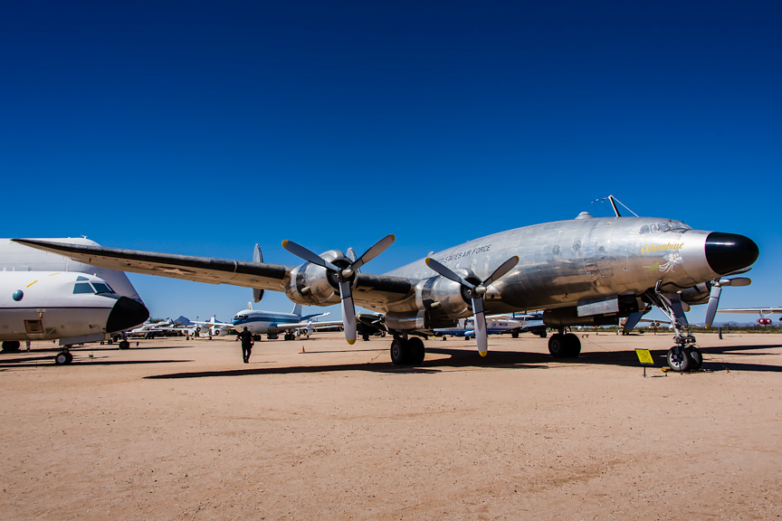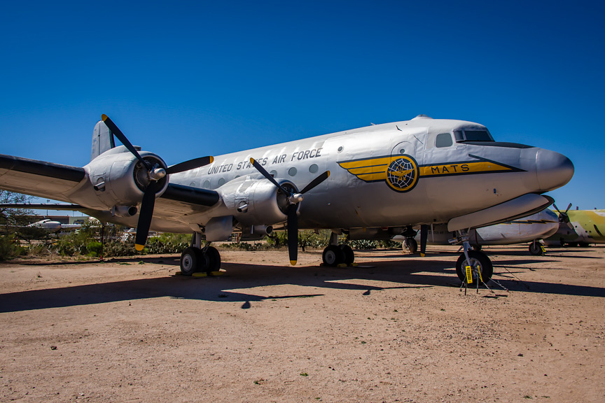 I spied this aircraft from a distance — it stood out because of the paint job, looking like a presidential plane. When I got close enough to read the lettering reading "UNITED STATES OF AMERICA", I was sure my initial impression was correct. This is a Douglas VC-118A Liftmaster, the militarized version of the civilian Douglas DC-6 airliner. This aircraft served for a time as the official Air Force One for President Kennedy. The VC-118A was subsequently replaced in that role by the jet-powered Boeing VC-137. However, this plane continued to be in use when the President was traveling to smaller airports which could not handle the VC-137 and for transporting lower-ranking VIPs.