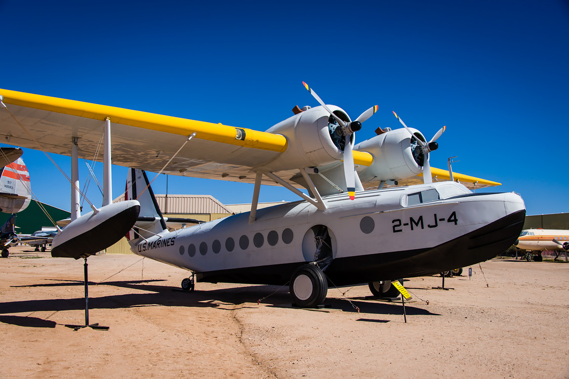 Today's last aircraft is a Sikorsky S-43 Baby Clipper, a smaller version of their S-42. It was introduced in 1934 and the primary user was Pan American World Airways for flights to Cuba and in Latin America. Three were used by Inter-Island Airways of Hawai‘i (the predecessor of Hawaiian Airlines) for flights between the Hawaiian Islands. The U.S. Navy purchased 17 with two assigned to duty with the Marines. Five were obtained by the U.S. Army Air Corps and used for transporting freight and passengers. Note that this model is amphibious — able to land on land or on water. When landing on water, the wheels retract into that convenient recess in the side of the fuselage. The positioning of the wing and engines above the fuselage also facilitate those water landings.
