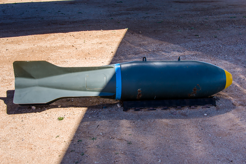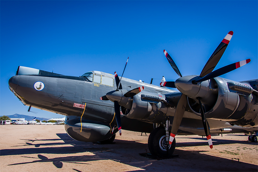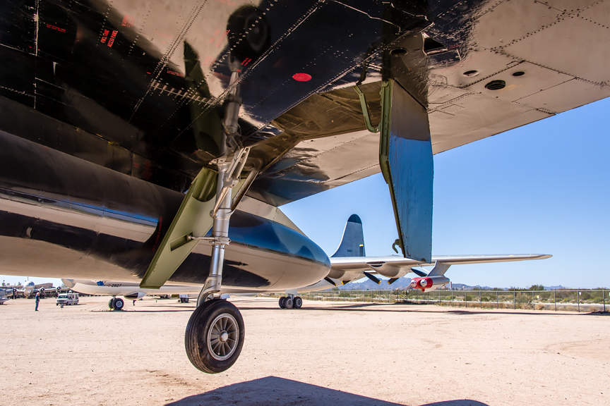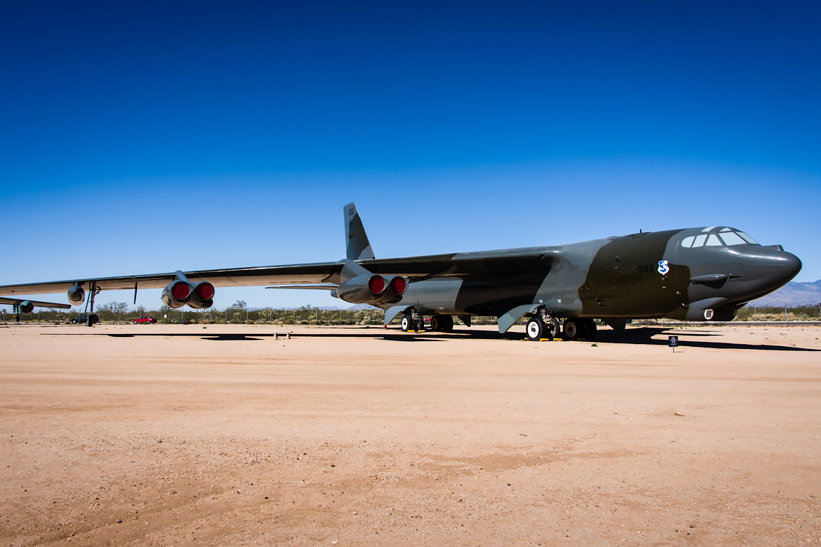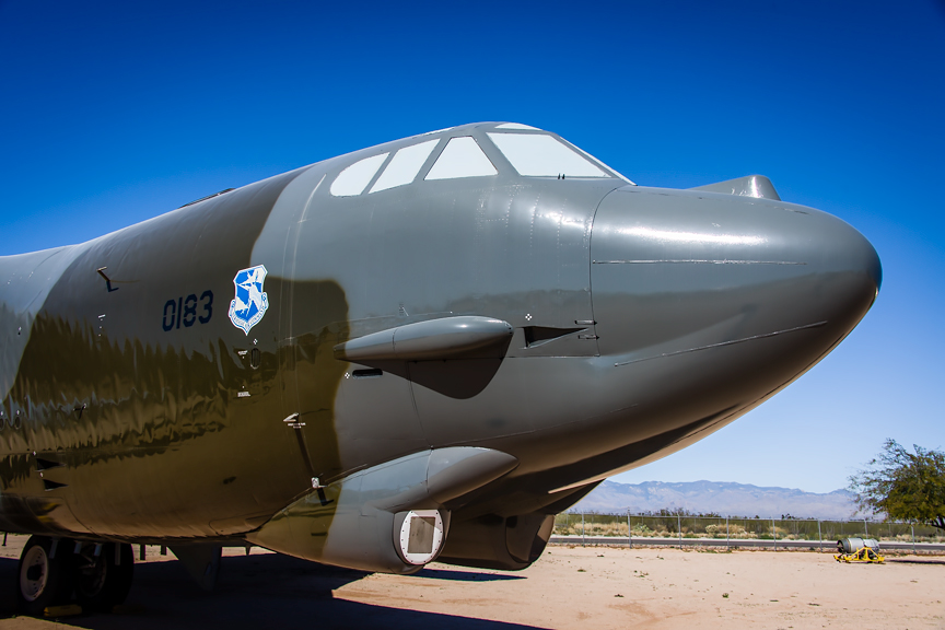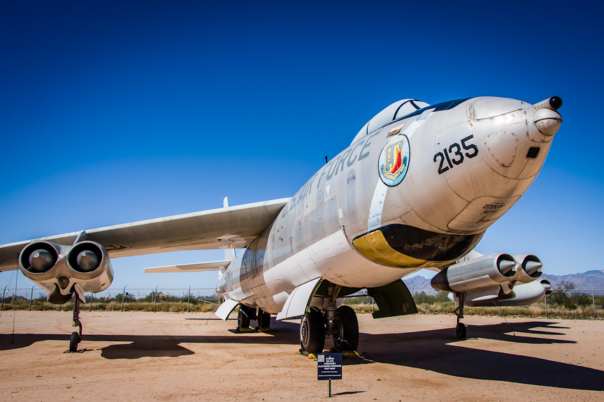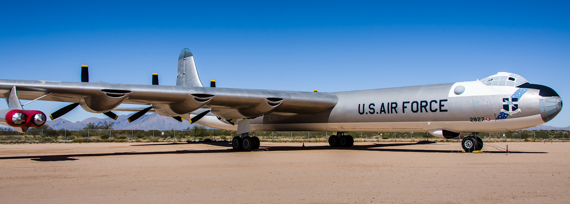 This next aircraft is the Convair B-36J Peacemaker, the largest bomber and the last piston engine-powered bomber produced by the United States. Because of concerns about the potential fall of Great Britain to Nazi Germany and the potential for Japanese strongholds in the Pacific, the U.S. Air Force issued an RFP for a long-range bomber that could strike Germany or Japan from North America. The result was the B-36. The B-36 was the first bomber capable of delivering any of the nuclear weapons in the U.S. arsenal from inside its four bomb bays without aircraft modifications. With a range of 10,000 mi (16,000 km) and a maximum payload of 87,200 lb (39,600 kg), the B-36 was capable of intercontinental flight without refueling. Beginning with the model designated B-36D, a pair of jet engines were added to the end of each wing. Consequently, the B-36 was configured to have ten engines, six radial propeller engines and four jet engines, leading to the B-36 slogan of "six turnin' and four burnin' ". There were 384 built with the B-36 going into service in 1949 and being retired in 1959. This aircraft is so large that I had to keep backing up in order to take a photo even though I was using the wide-angle end of the range in my zoom lens. I cropped this shot so it looks like a panoramic shot (actually only cut out some sky and dirt).
