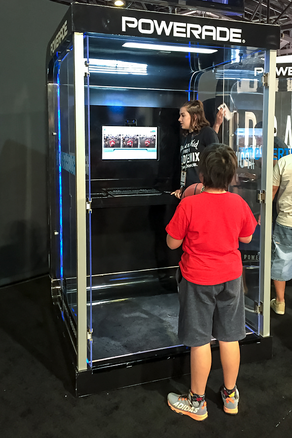 Most of the Fan Fest was a marketing opportunity for large corporations, especially those that have some connection to sports. Here was a booth from Powerade, a sports drink manufactured and marketed by the Coca-Cola Company. The booth was set up to take photos of the fans — that's Johnny shyly holding a basketball while the shutter snapped.