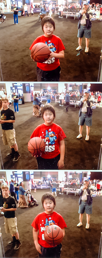 This was really cute — Capital One (credit card company) had a special studio set up with multiple cameras whose images would be stitched together by computer into a 360° shot. Kids of all ages could have such a photo taken which was then shown on a big-screen TV just outside the booth — animated with the camera angle circling around them. Usually, the helpers tried to get the participants to jump up in the air — these kids didn't get it but their resulting shot was incredibly cute.