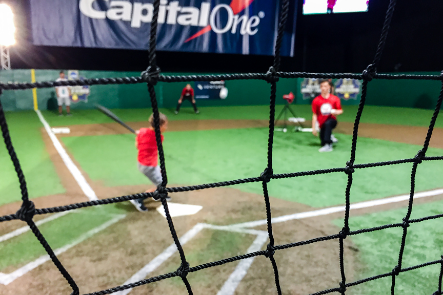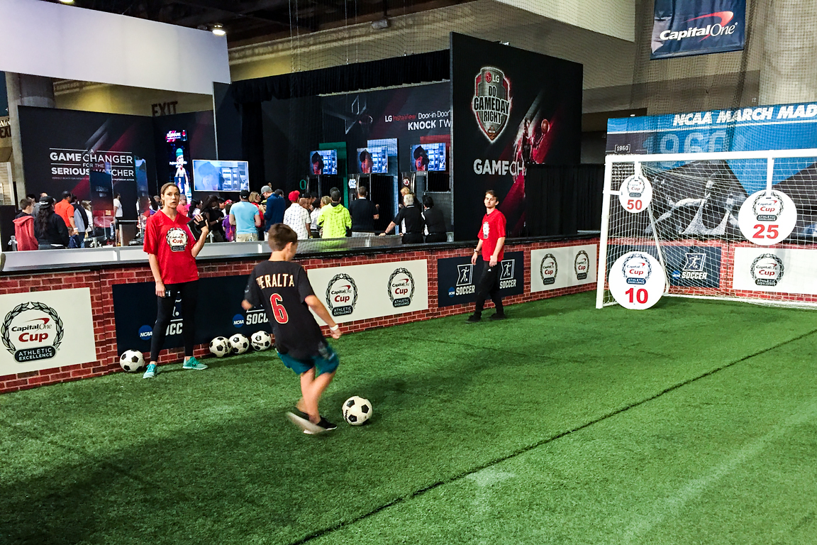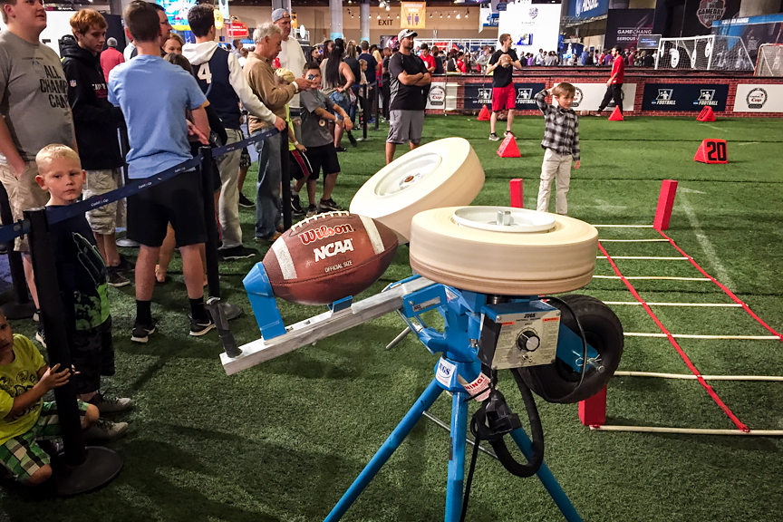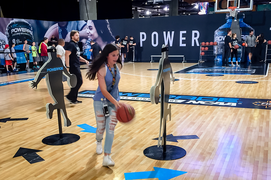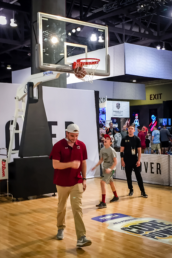 The whole main exhibit hall was set up with opportunities for attendees to try out their skills in the sport of their choice. This challenge was dribbling a basketball around stationary defenders (who also had baseballs?).