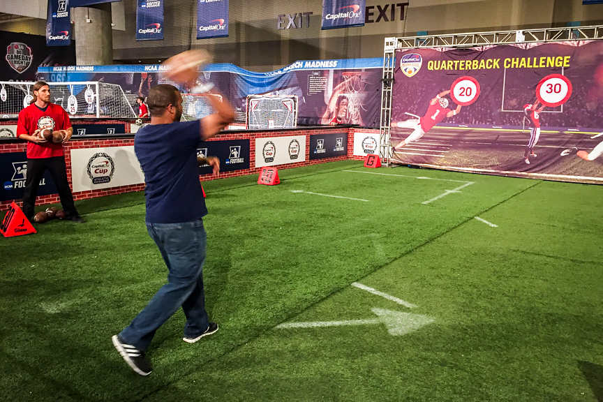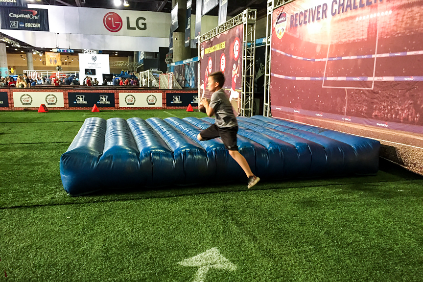 Each amateur QB tried to throw the football through one of the numbered circles. If successful, he or she would be awarded the number of points displayed. I did not see any successful tosses during the brief time I stood here.