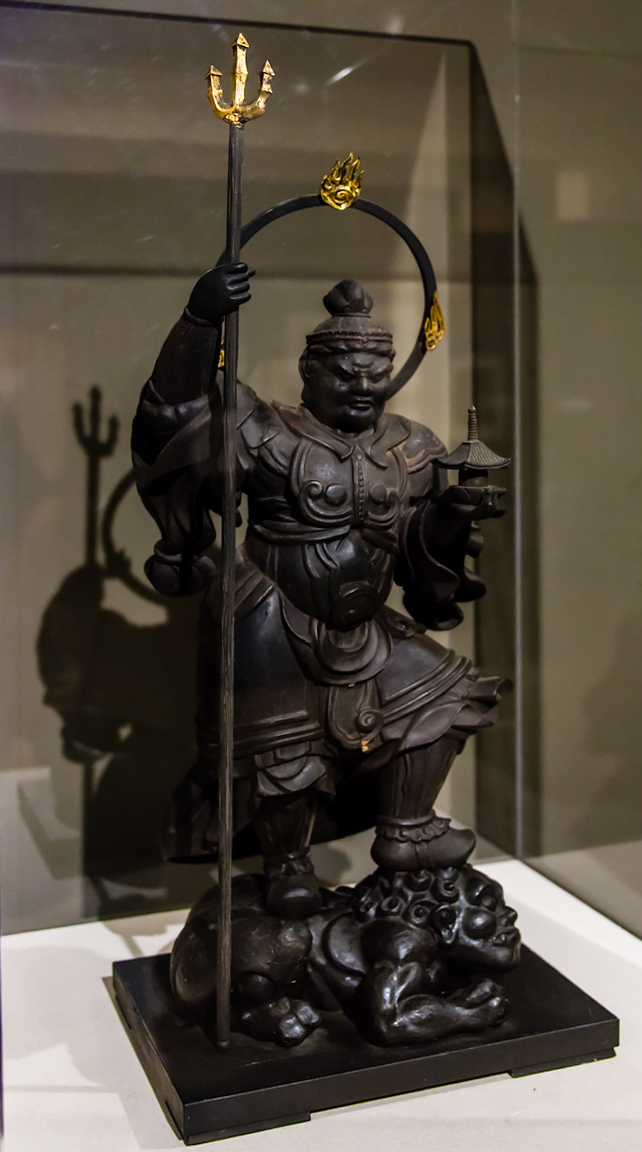 Our last photo is of Bishamonten, a god whose name means "he who listens to many teachings". He is associated with war and warriors, as he is most often shown clad in armor. The pagoda he holds represents the heavenly treasure house, which he both protects and dispenses from. His trident represents the Three Buddhist Jewels — the Buddha, the Darma (Buddhist Law) and the Sangha (Buddhist Community).