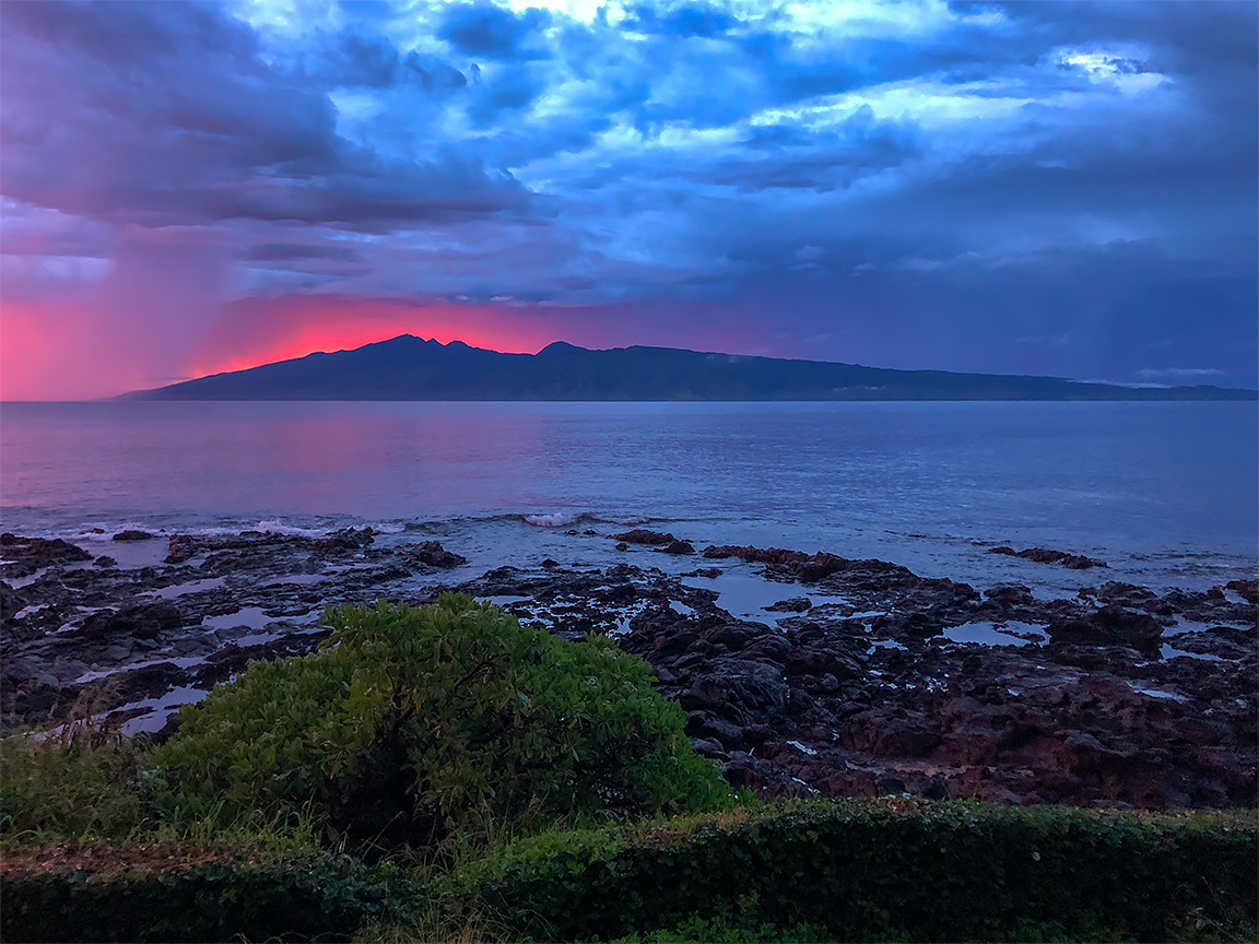 Tonight I strolled down to the lower pool here at Napili Shores where I often enjoy the early evening breeze. Not much breeze tonight but a spectacular sunset. The first photo shows the lighting of the sky beyond Moloka’i. It looks like a forest fire on the far side — or maybe a volcanic eruption.