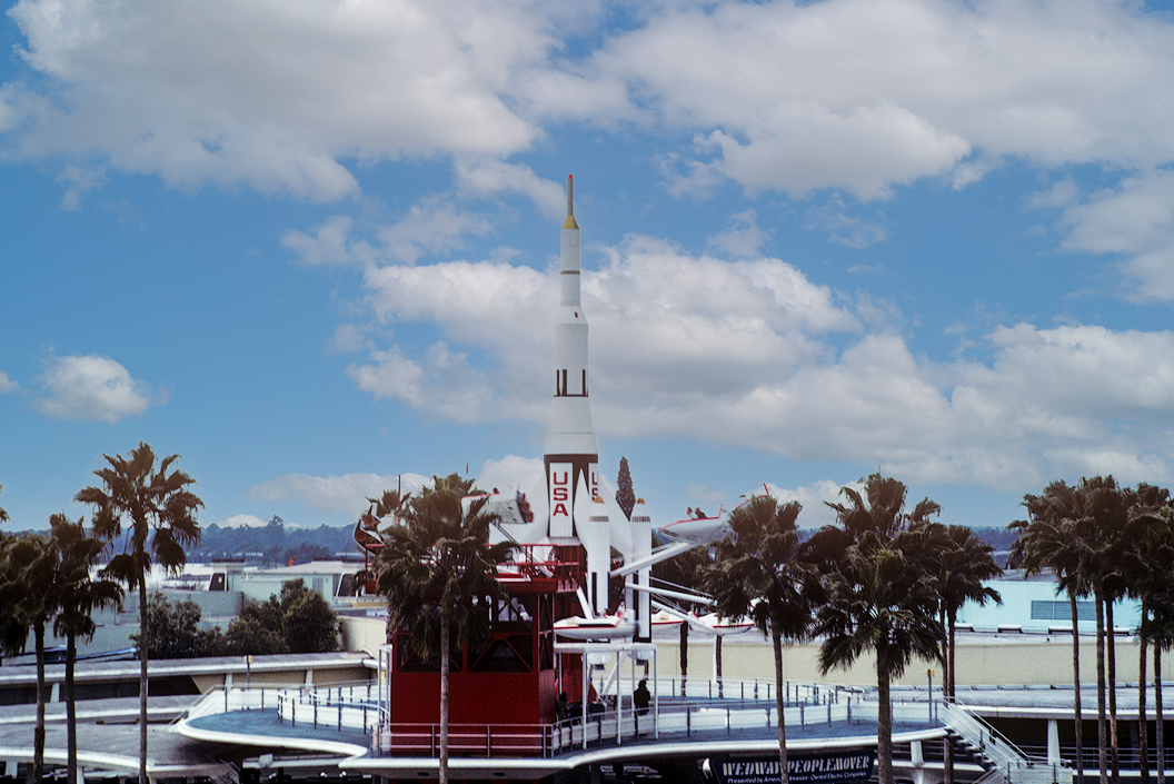 Over in Tomorrowland, one finds the Star Jets. You board one of the spacecraft which rotates around the rocket in the middle. An onboard control allowed you to raise and lower the craft. Sometimes people would follow the vertical path of the one in front of them resulting in an undulating pattern.