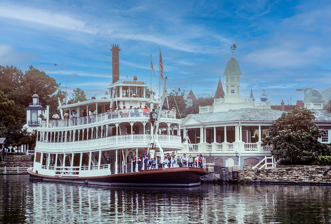 It’s no secret that Walt Disney, the man, loved all kinds of transportation. The Magic Kingdom’s Liberty Square Steamboat attraction did not open on the first day, but it did sail for the first time on the second day of the park on October 2, 1971. This Mississippi Steamboat replica took guests on a 17-minute ride guided on an I-beam that is buried under the green and brown dyed water. The ride operator sat on the upper deck and was responsible for blowing the whistle, ringing the bell, and prompting the narration that accompanied the cruise on the Rivers of America.