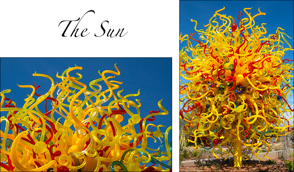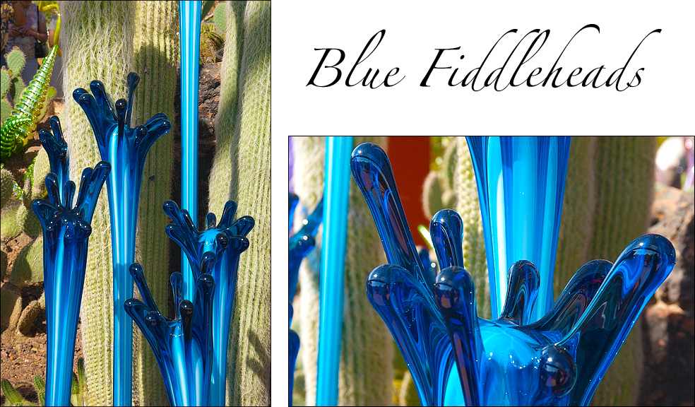 | As you may recall from previous issues, one of my favorite places in Phoenix is the Desert Botanical Garden. I love the rich variety of desert flora and fauna — so very different from that of temperate or even tropical climes. Recently, they held a special exhibit — Chihuly: the Nature of Glass — which I visited some weeks ago. I was so impressed, that I sent a special message to you, my friends and family, to make sure you did not miss it if you live in the Phoenix area or if you were visiting. Yesterday was the last day of the exhibit — if you were snoozing, your loss. However, in the next few issues, I will share my photos from the exhibit — I guess it is the next best thing to being there. |