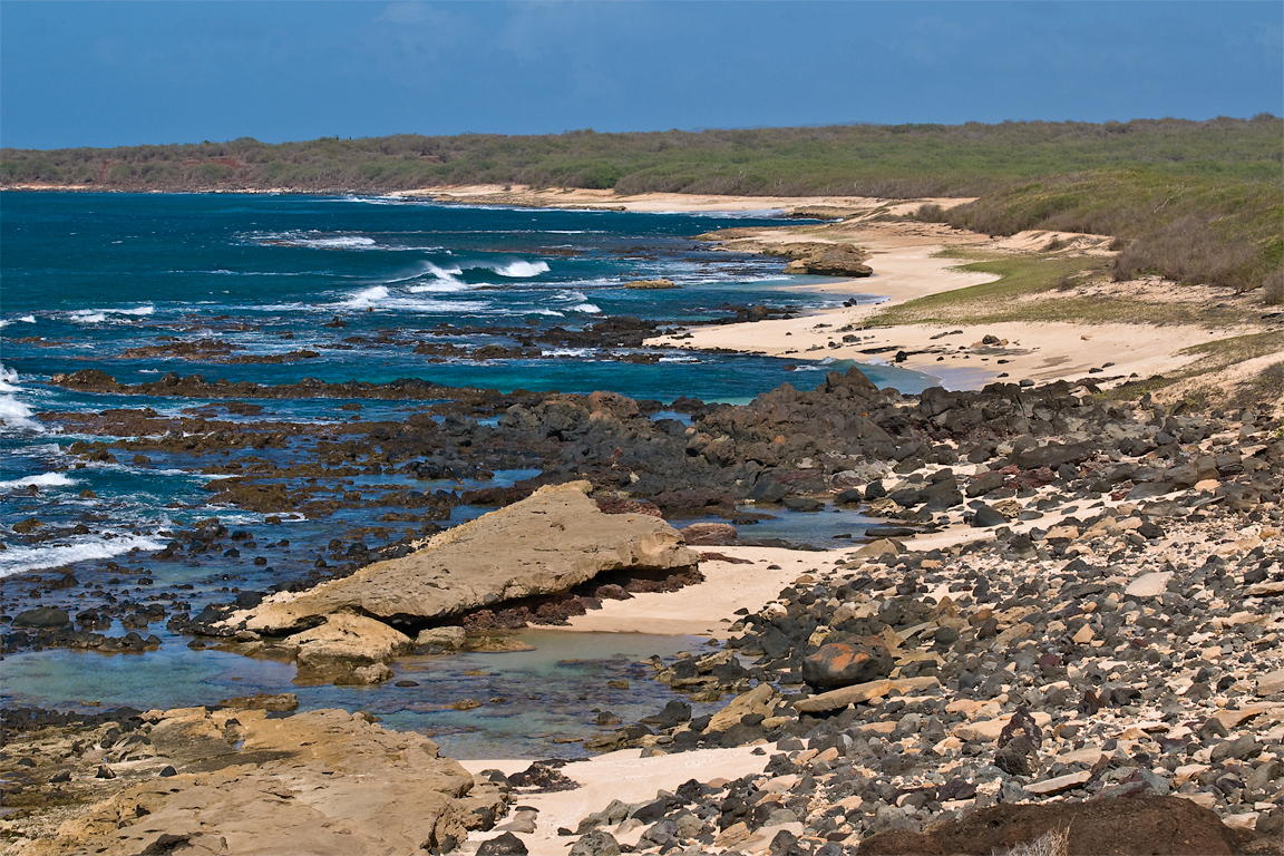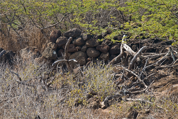 If you are ever lucky enough to duplicate my hike, you will begin to understand the passionate feelings of the Hawai`ian people about this area. Here I encountered another heiau, partially overgrown with Keawe. If the owners of the Moloka`i Ranch had been successful in obtaining permits to sell luxury homesites here, sites like this which are sacred to Hawai`ians likely would have been bulldozed over. That part of me that feels like I was Hawai`ian in a previous life shutters and sheds a tear for all that has been lost and for the threat to these few remaining sacred spots. |