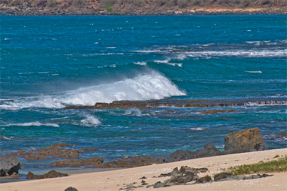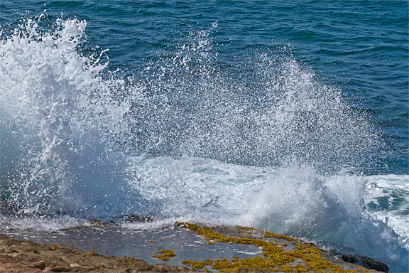 Although, I have to admit that the waves did make a BIG impression when they hit the rocks — with spray shooting way up into the air. Of course, the photographer has to cover the camera lens immediately after the shot so as not to get spray on the glass. I was carrying a lens cleaning cloth but you hate to have to clean the lens every few minutes. |