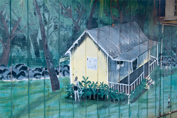 It is a good idea for a photographer to wander about from time to time without any particular subject in mind — allowing your relaxed brain to take in all that you see — not knowing what might be an interesting image to capture. It was in this state of mind that I happened to notice this painting on the side of one of the buildings in Kaunakakai — capturing a traditional plantation-style cottage complete with tin roof. The more I looked at it, the more I was transported to another time in this magical place called Hawai`i. |