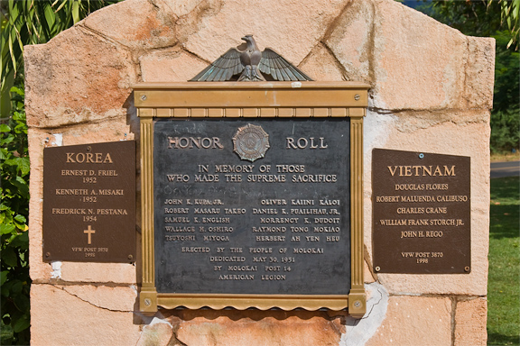 Nearby I was jolted back to the reality of our modern world with this memorial to those residents of Moloka`i who gave their lives in World War II, the Korean War and the War in Vietnam. Curiously, there were no names posted for the wars in Iraq and Afghanistan — let's hope that is because there have been none in those conflicts. |