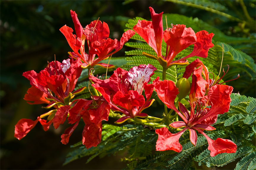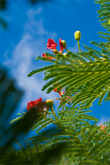 In this small, peaceful memorial park I spotted a Royal Poinciana tree that still had a few showy blossoms. This time of year, most should have fallen but this cluster was going strong. |