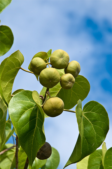 Moving on, I drove down to the harbor and encountered this tree with some kind of fruit — with what appeared to be nuts inside. The tree was growing on an area set up for the local canoe clubs so I asked one of the older kids if he knew what it was — but he did not. My guess is that it is a Kukui tree — if not, I am sure someone will let me know. |